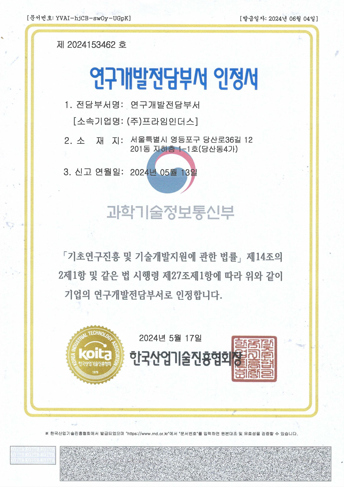 연구개발전담부서 인정서