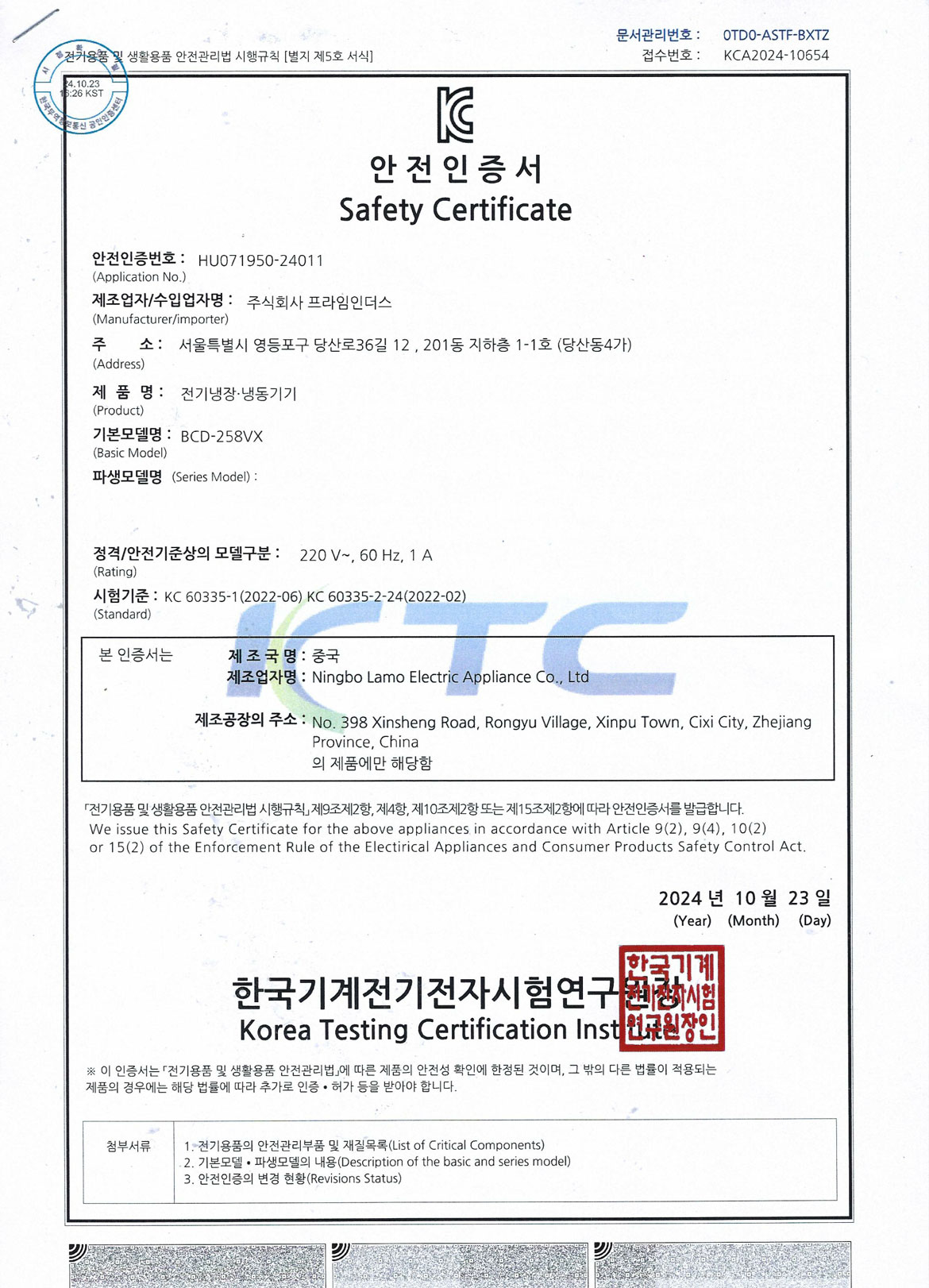 전기냉장냉동기기 안정인증서