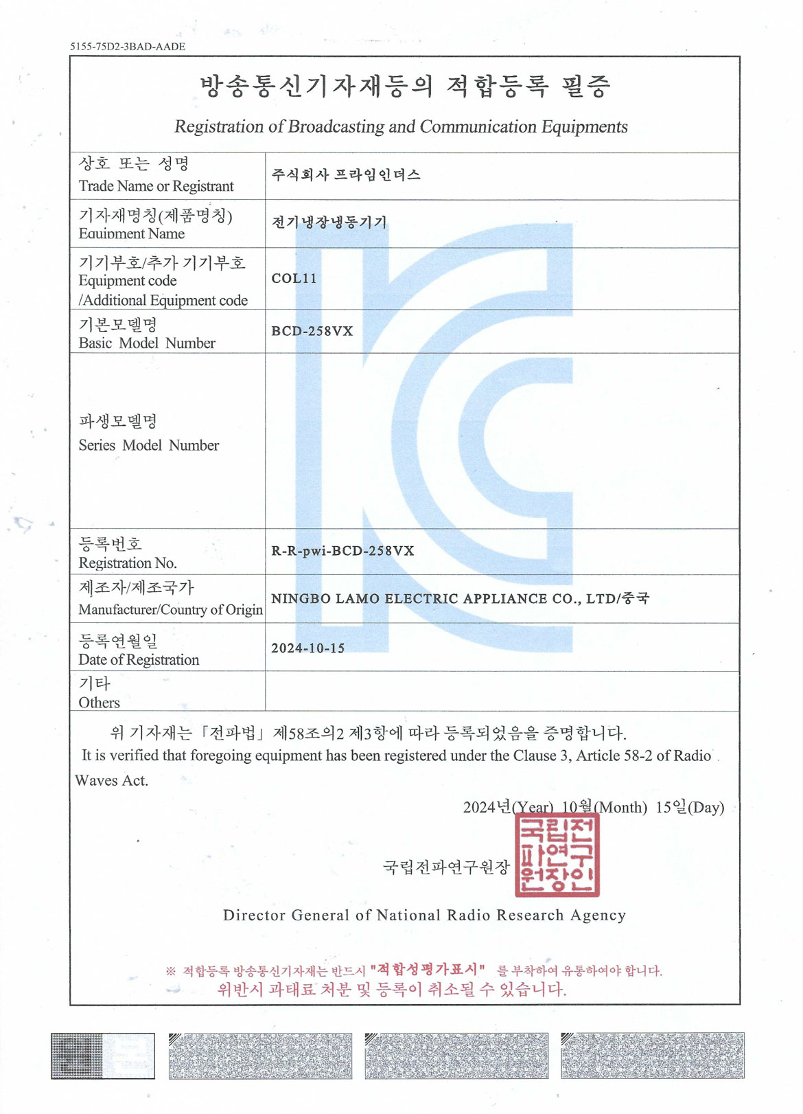 전기냉장냉동기기 적합등록 필증