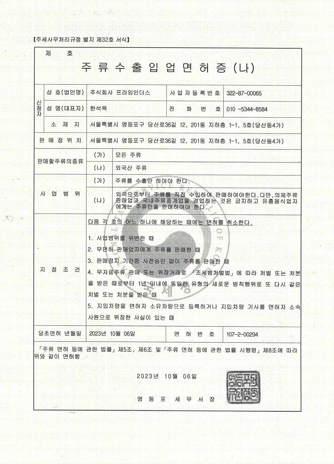 주류수출입업면허증
